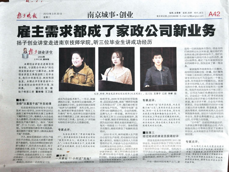 《扬子晚报》A42版—《雇主需求都成了家政公司新业务——扬子创业讲堂走进米兰官方网站,听三位毕业生讲成功经历》