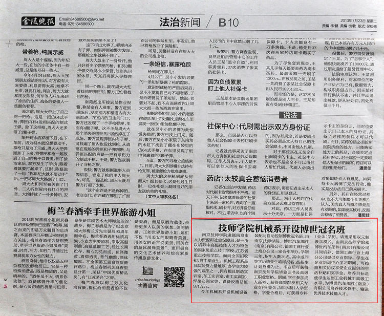 《金陵晚报》B10版—《技师学院机械系开设博世冠名班》