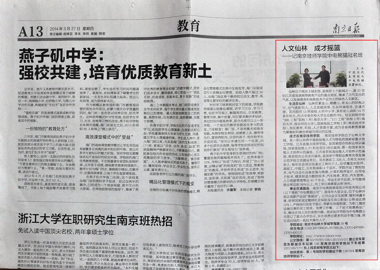 《南京日报》A13版—《人文仙林 成才摇篮—记米兰官方网站中电熊猫冠名班》