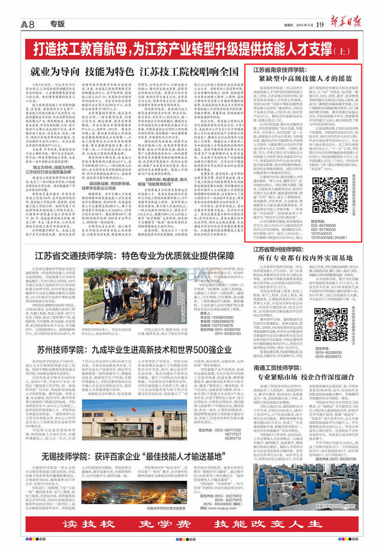 《新华日报》A8版—江苏省米兰官方网站:紧缺型中高级技能人才的