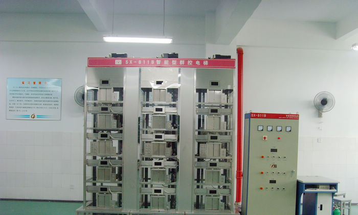 ⑵设电梯排故实训室1个,配置教学透明电梯6台、联网型群控电梯1套(五层三组)。