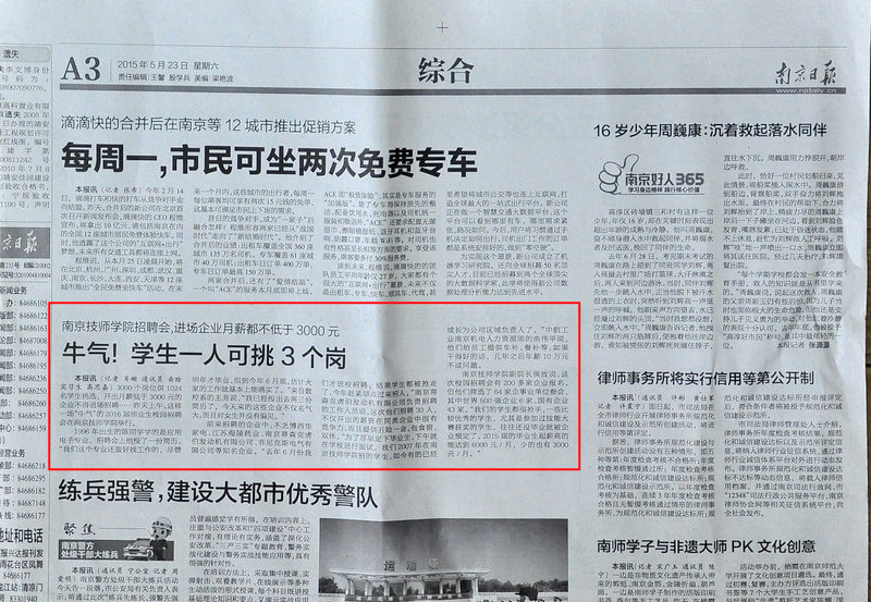 《南京日报》A3版—“牛气!学生一人可挑3个岗”