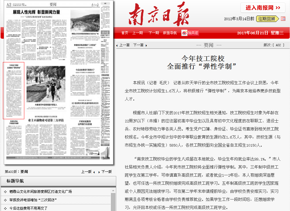 《南京日报》—A2今年技工院校全面推行“弹性学制”