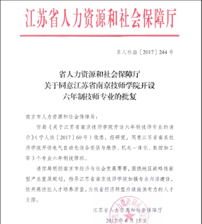 我院接到《省人力资源和社会保障厅关于同意江苏省米兰官方网站开设六年制技师专业的批复》(苏人社函[2017]244号),同意开设电气自动化设备安装与维修、机电一体化、数控加工等3个专业。