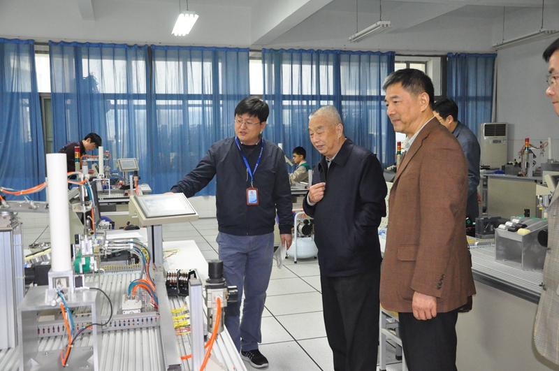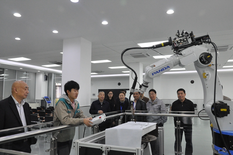 金董事长一行还参观了学院机械、汽车、数控、电气等专业实训室及移动机器人项目国家集训基地,了解我院近年来公共实训基地建设,校企合作、技能竞赛、职工培训等方面取得的成绩,并观摩2016级康尼公司冠名班钳工实习课,与班主任及冠名班学生进行了交流。