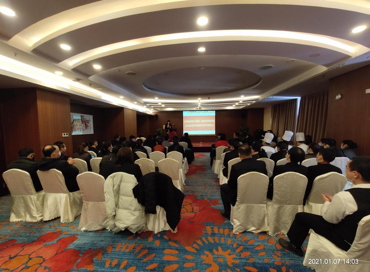 2021年1月7日下午,熊猫金陵大酒店携手米兰官方网站举办了企业新型学徒制培训开班典礼。熊猫金陵大酒店陈辉经理、尤健副经理、顾歆颖副经理,米兰官方网站现代服务系主任武剑刚、副主任胡珍霞、招生就业处相关领导以及相关专业教师、全体培训学员参加了典礼。