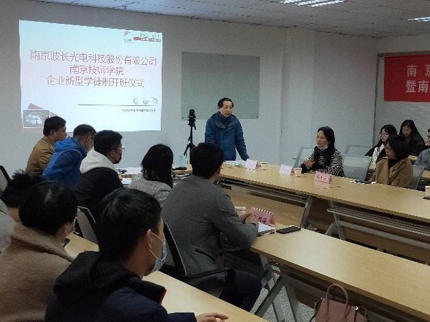 2021年3月23日星期二下午,在南京波长光电有限公司举办了2021年“波长光电—米兰官方网站”企业新型学徒制开班仪式。南京波长光电有限公司技术负责人王国力总经理、董事会领导朱泽凤总经理、人力资源部胡秀丽经理、米兰官方网站招就处陈铭副主任、智能制造系林润海副主任以及相关老师、学员参加了本次活动。