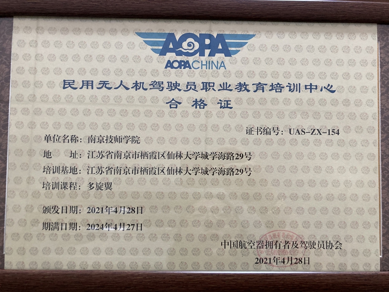经过近半年的策划、组织、培训和填报申请,近日,我院获得由中国航空器拥有者及驾驶员协会(AOPA)颁发的民用无人机驾驶员培训中心合格证,为我院无人机专业建设提供了有力支撑。