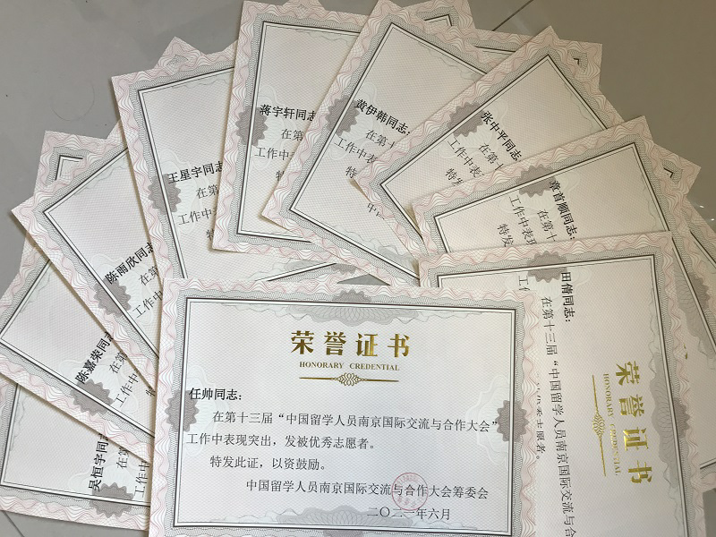 会议期间,我院全力配合,精心组织选派的71名志愿者积极主动、认真负责、任劳任怨,为会议提供了热情、周到、细致的保障服务,表现出了很强的组织能力和极高的服务水平,其中任帅等10名志愿者表现突出,被中国留学人员南京国际交流与合作大会筹委会授予“优秀志愿者”荣誉称号。