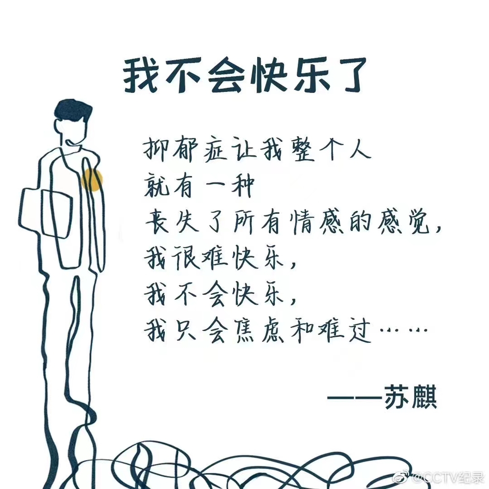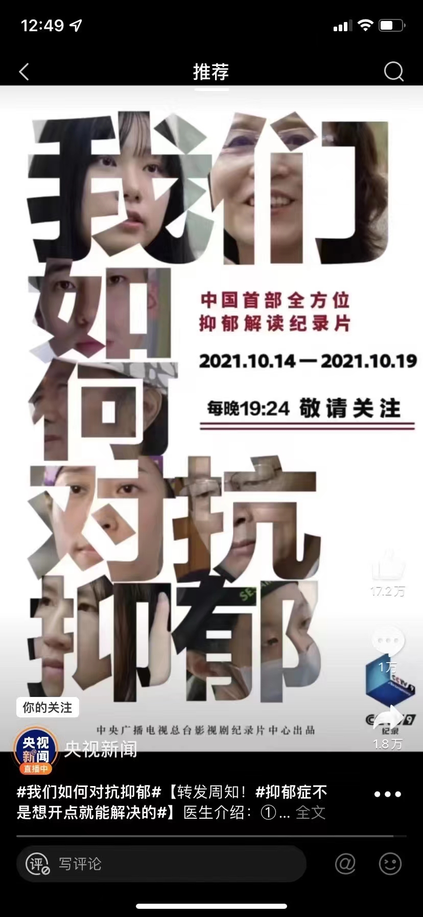 1014日至1919:24,CCTV9将连续六天播放《我们如何对抗抑郁》纪录片,作为中国首部全方位解读抑郁的系列纪录片,节目面对抑郁高危群体,走近真实的抑郁疾病患者,并追访医学界、科学界专家与学者,希望从个人、家庭、社会多角度呈现对抗抑郁的经验、路径与方法。