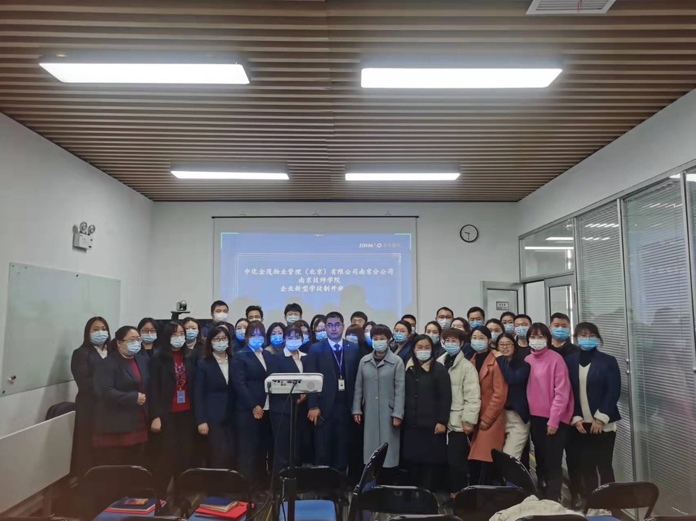 2022年1月19日下午,米兰官方网站现代服务系、中化金茂物业管理(北京)有限公司南京分公司企业携手举办新型学徒制培训开班典礼。金茂服务南京中心城市公司总经理助理王善知、米兰官方网站招生就业处副主任郑燕、现代服务系副主任胡珍霞以及相关专业教师和各岗位代表员工参加了开班典礼。