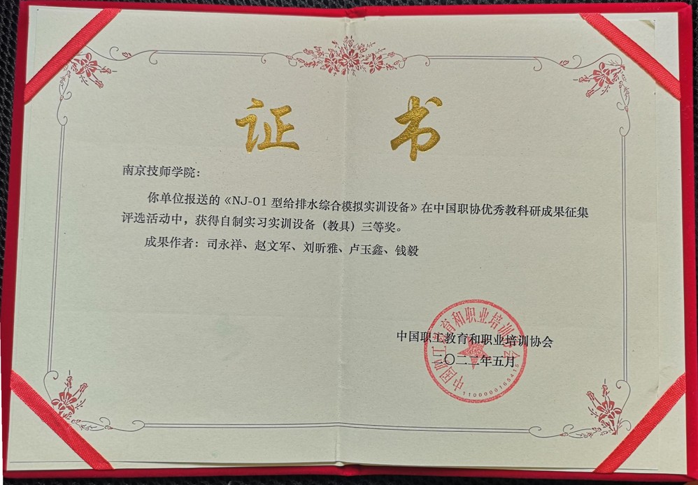 张金梅、赵杰、吴佑林、司永祥、孙凤恩5位老师的《技工院校“校-政-企合作冠名班”创新培养模式的研究与实践》获得通过鉴定的科研课题三等奖,司永祥、赵文军、刘昕雅、卢玉鑫、钱毅5位教师的《NJ-01型给排水综合模拟实训设备》获得自制实习实训设备(教具)三等奖。