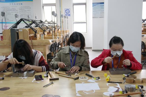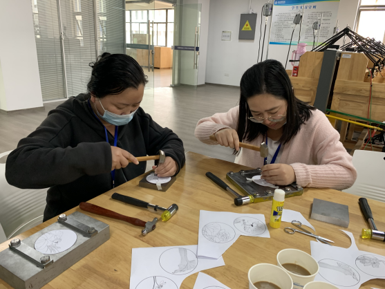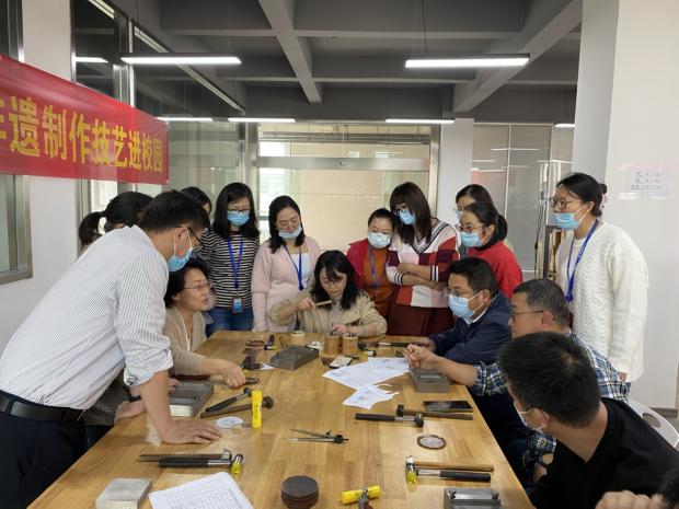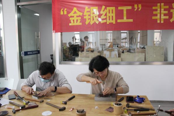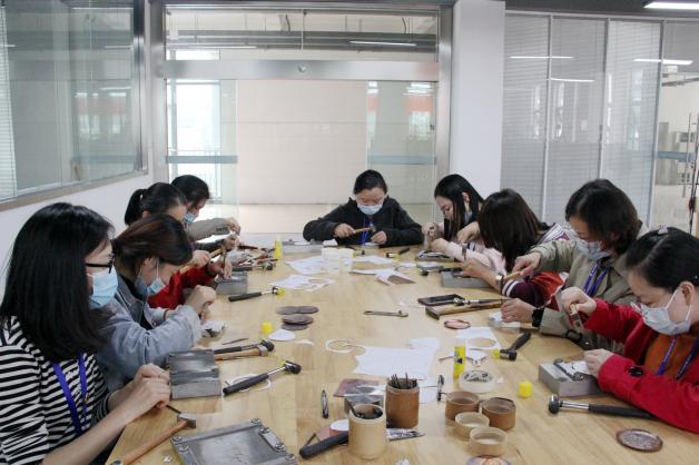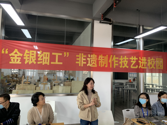 讲座中,李女士介绍了金银细工制作技艺的相关知识,详细示范了制作流程,参加讲座的教师认真聆听,并亲自动手参与制作。