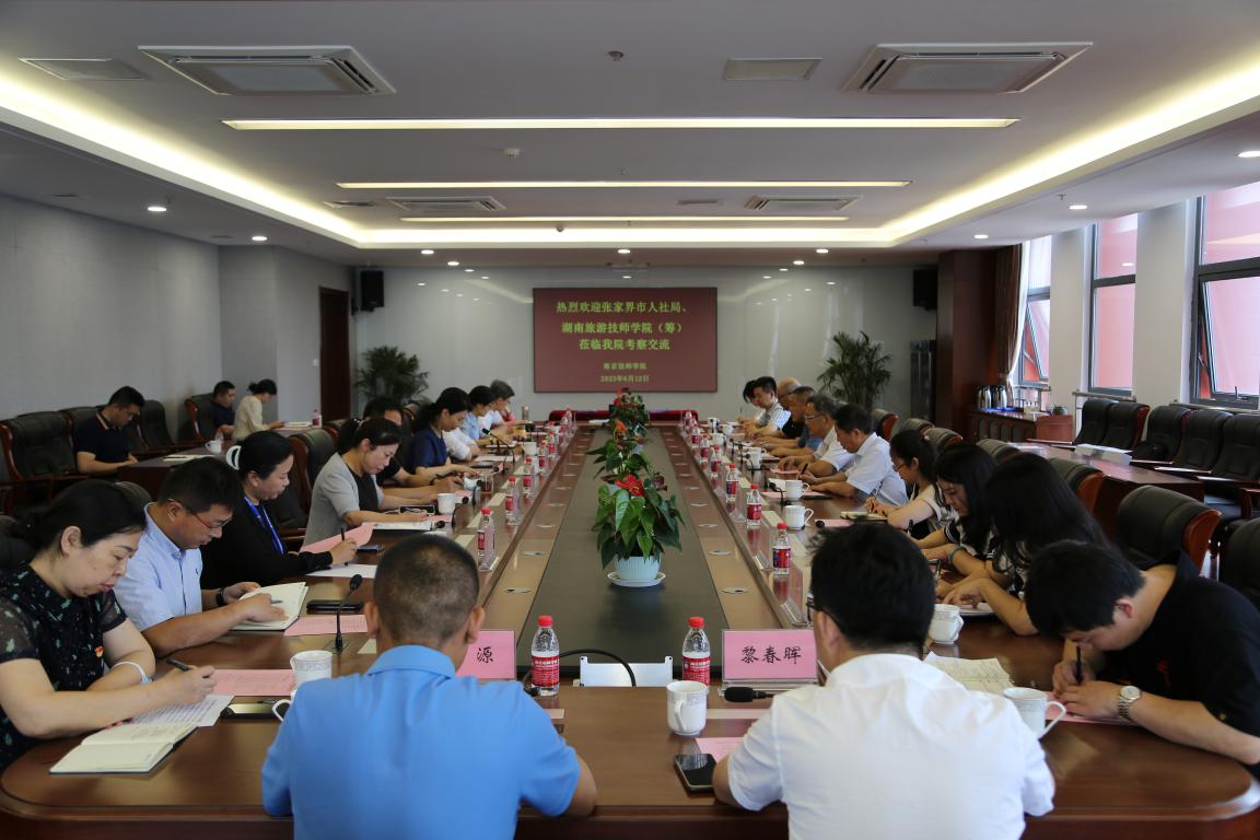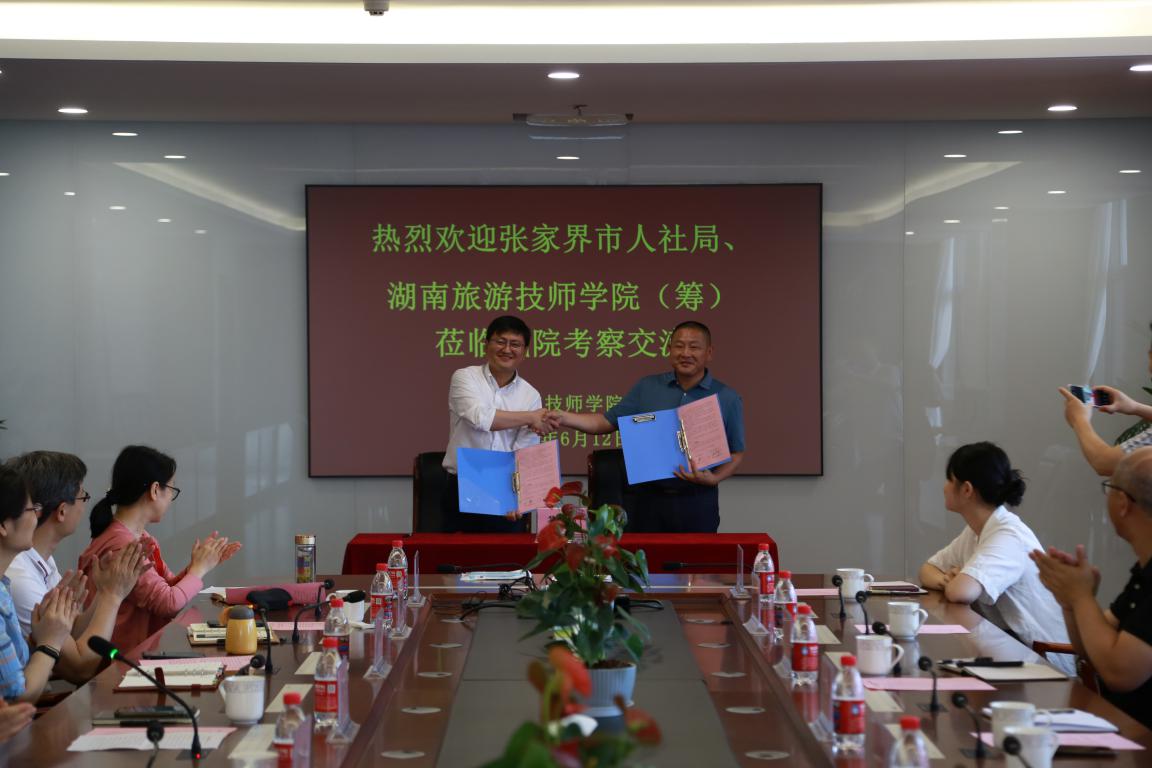 6月12日上午,张家界市人力资源和社会保障局二级调研员刘奇志、湖南旅游技师学院(筹)党委书记欧阳仁德带队来校考察交流,对接对口合作落实措施,并签订校校对口合作协议。米兰官方网站党委书记张金梅、副院长赵杰,湖南旅游技师学院(筹)副校长姚志勇及双方相关人员参加了座谈交流。