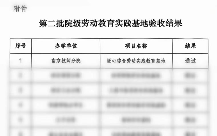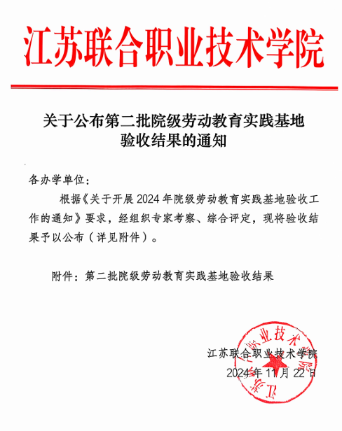 为全面贯彻党的教育方针,围绕立德树人根本任务,进一步发挥劳动教育在立身、立心、立德中的基础作用,按照江苏联合职业技术学院“十四五”期间院级劳动教育实践基地创建工作要求,学院作为第二批创建单位,积极投身“匠心综合劳动教育实践基地”创建工作,经专家综合评定,1122日顺利通过验收。