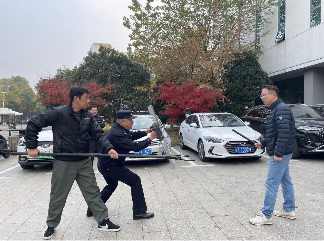 演练前,学院制定了详细的演练预案,由院安全稳定工作领导小组统一指挥并做好周密布置。张警官从警棍、盾牌、钢叉、抓捕器等防暴器材的正确使用,最小应急单元“二对一”“三对一”战术对抗的实施等方面,为安保处、青年教工应急队、保安队进行了安全技能培训,并提出了安全防范要求。